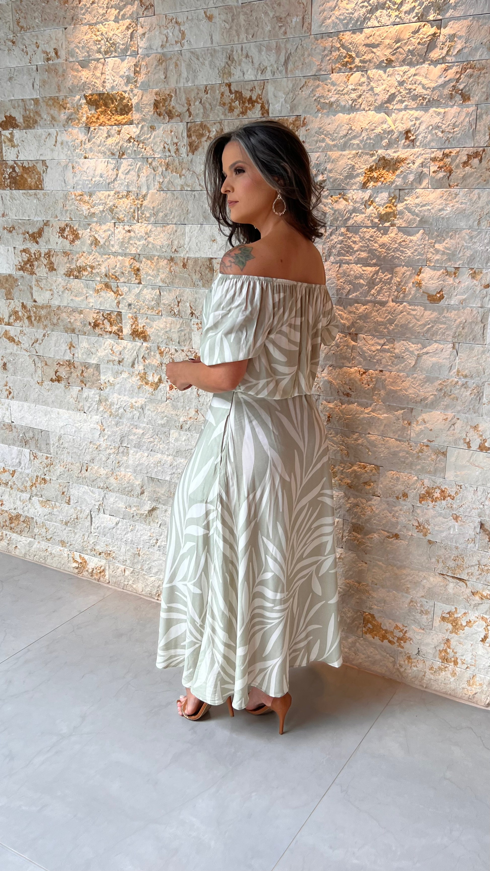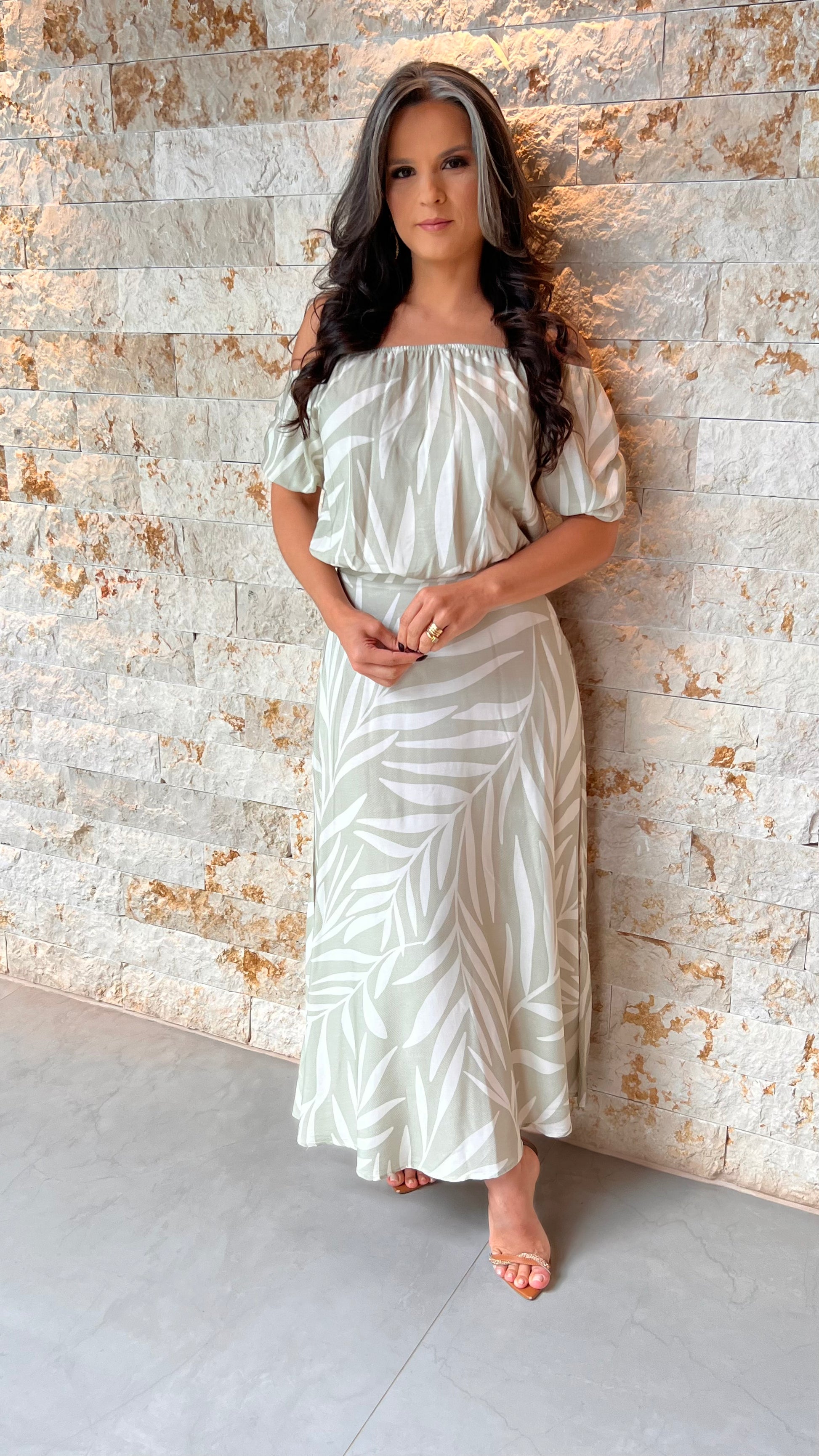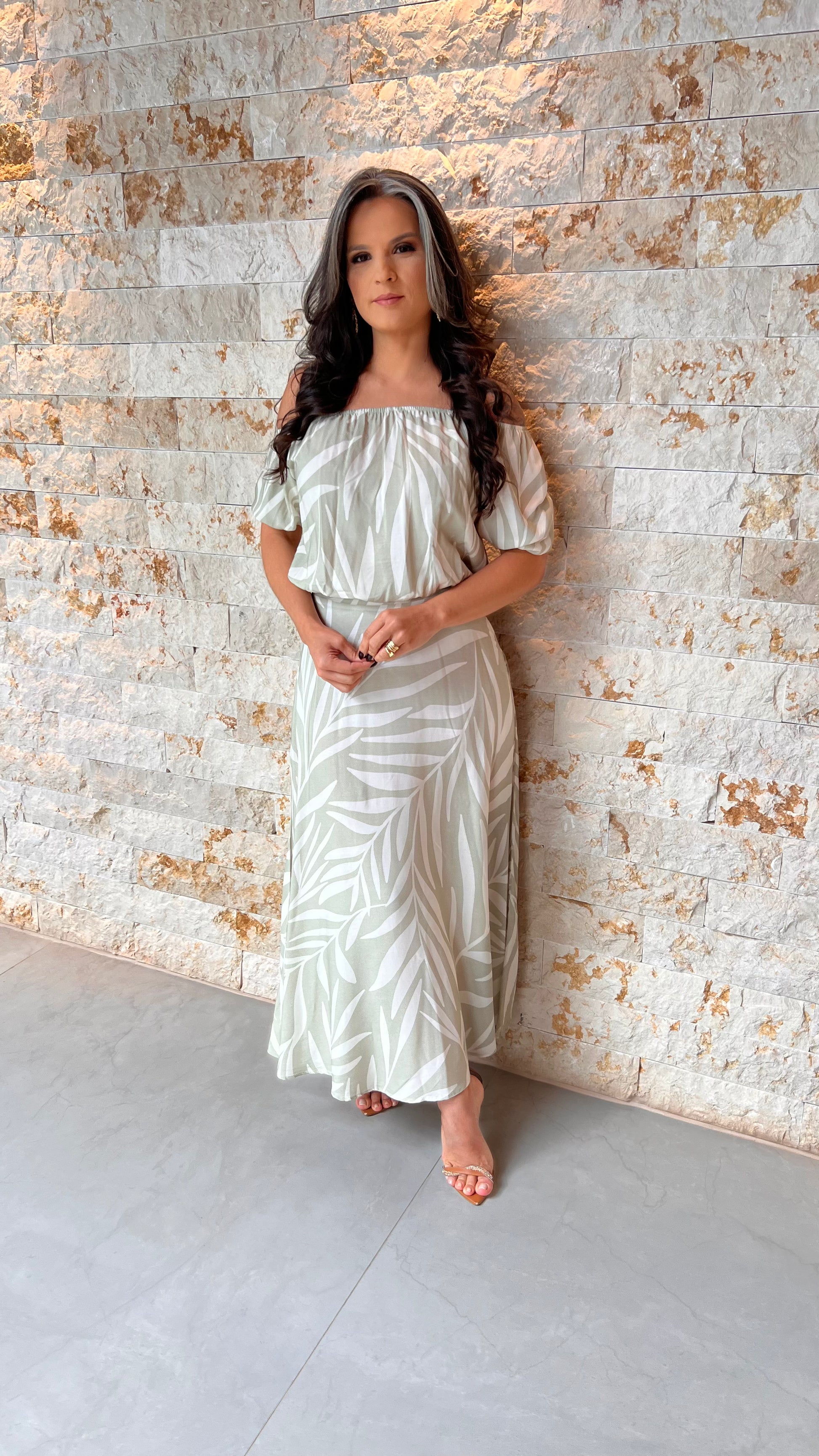 Vista-se para o verão e o ano todo, com este conjunto que une o charme da estampa tropical à elegância do corte midi.