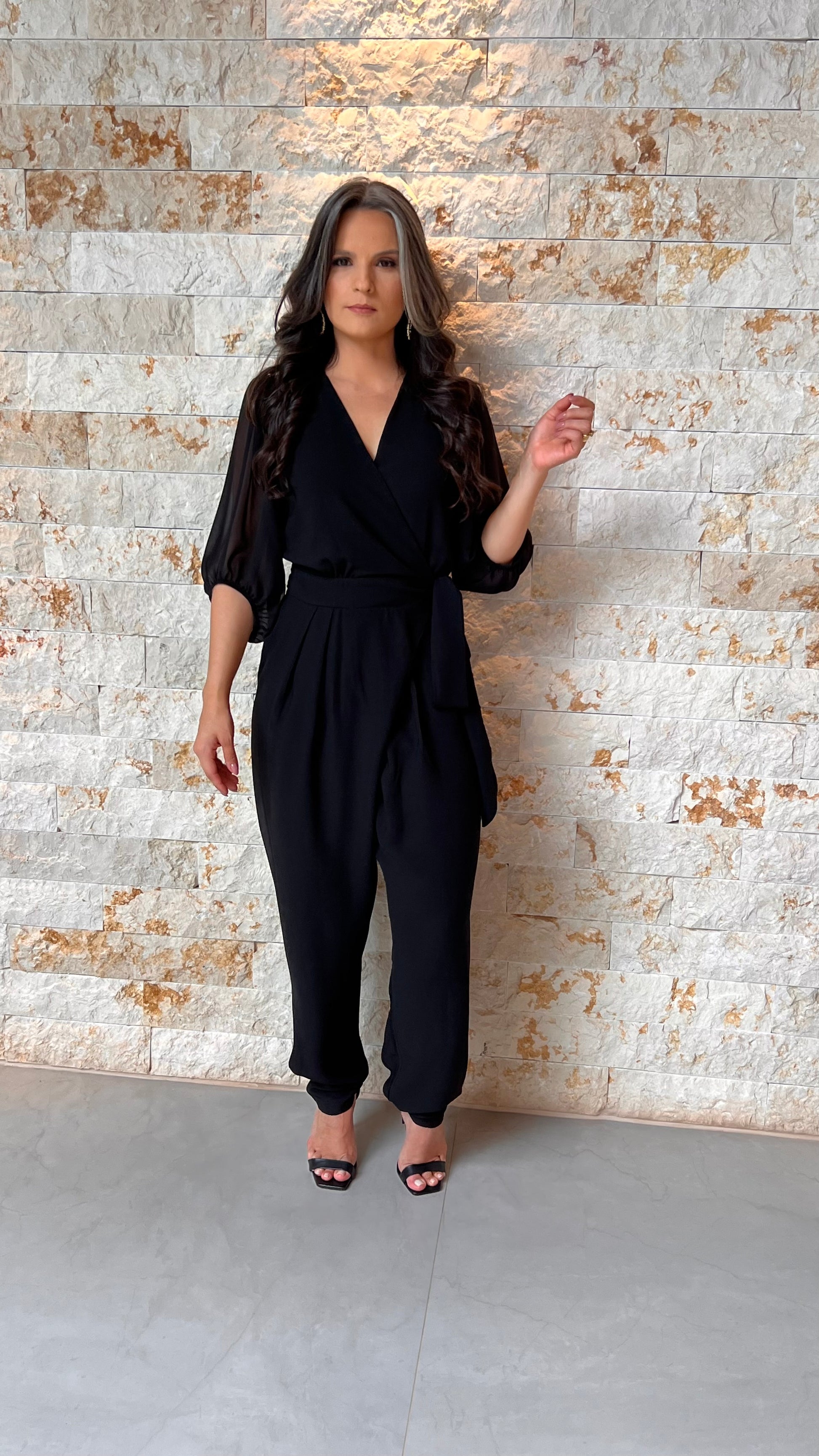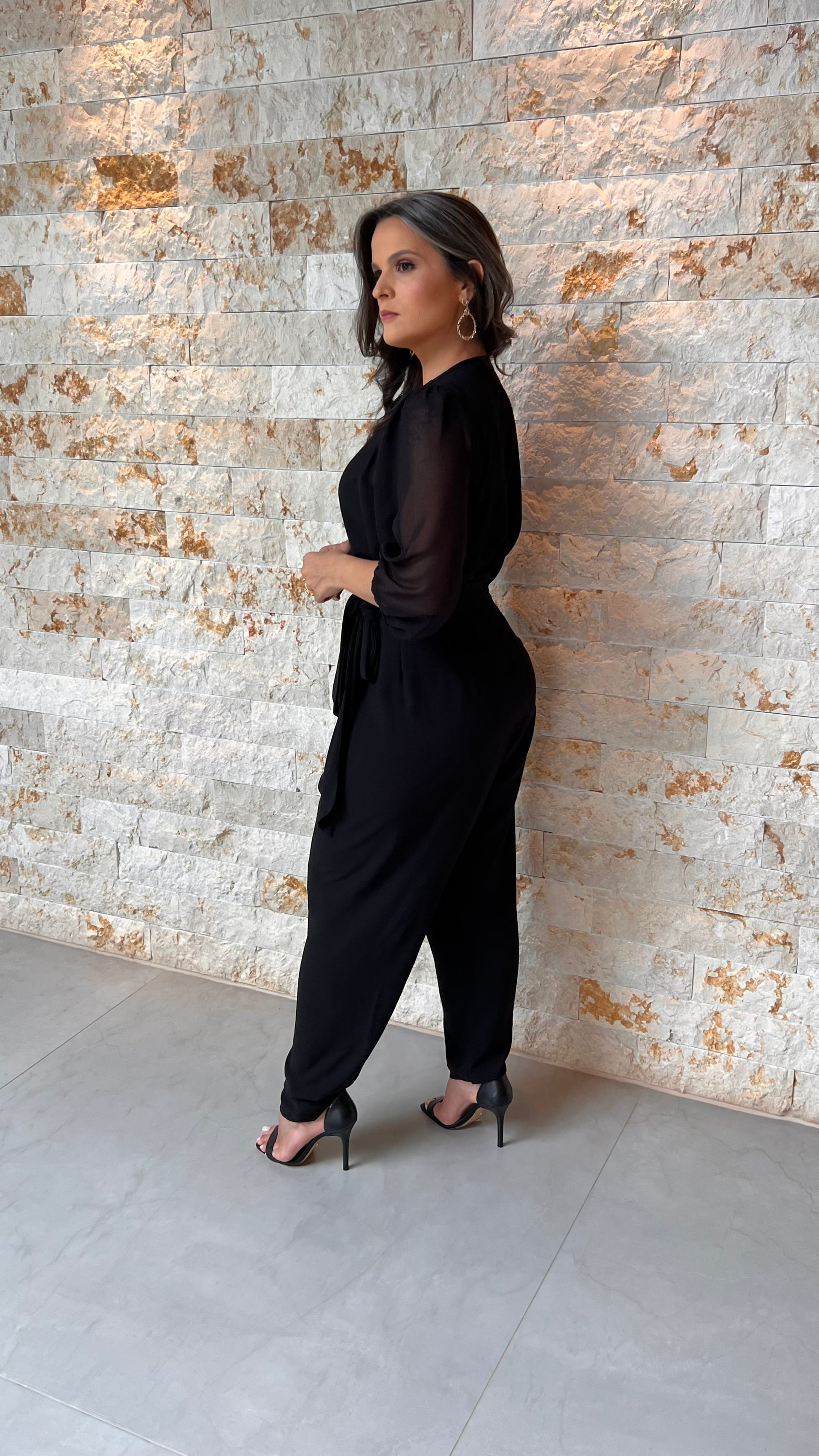 Este macacão é a alternativa moderna e chique ao vestido de festa ou ao terninho. A combinação de tecidos opacos e transparentes na parte superior eleva o visual, tornando-o perfeito para: