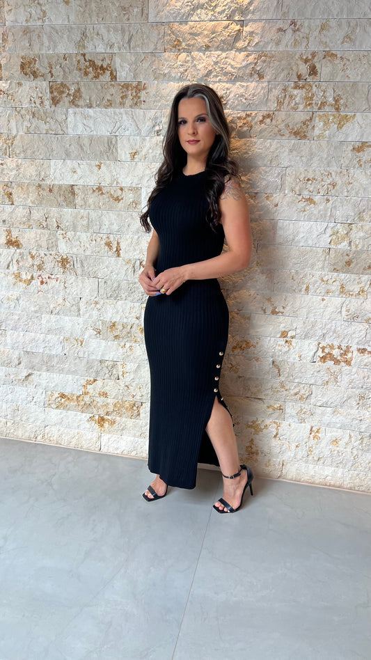 Vestido Midi Fenda Botões POLI- Preto 5895