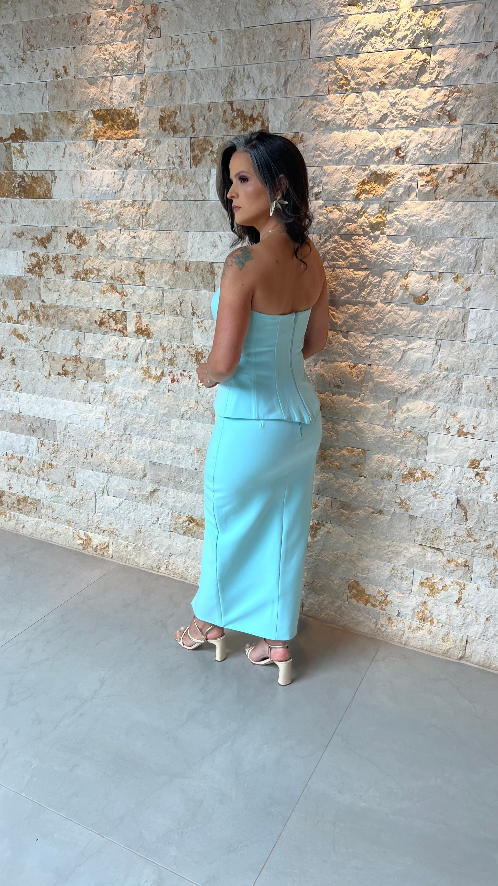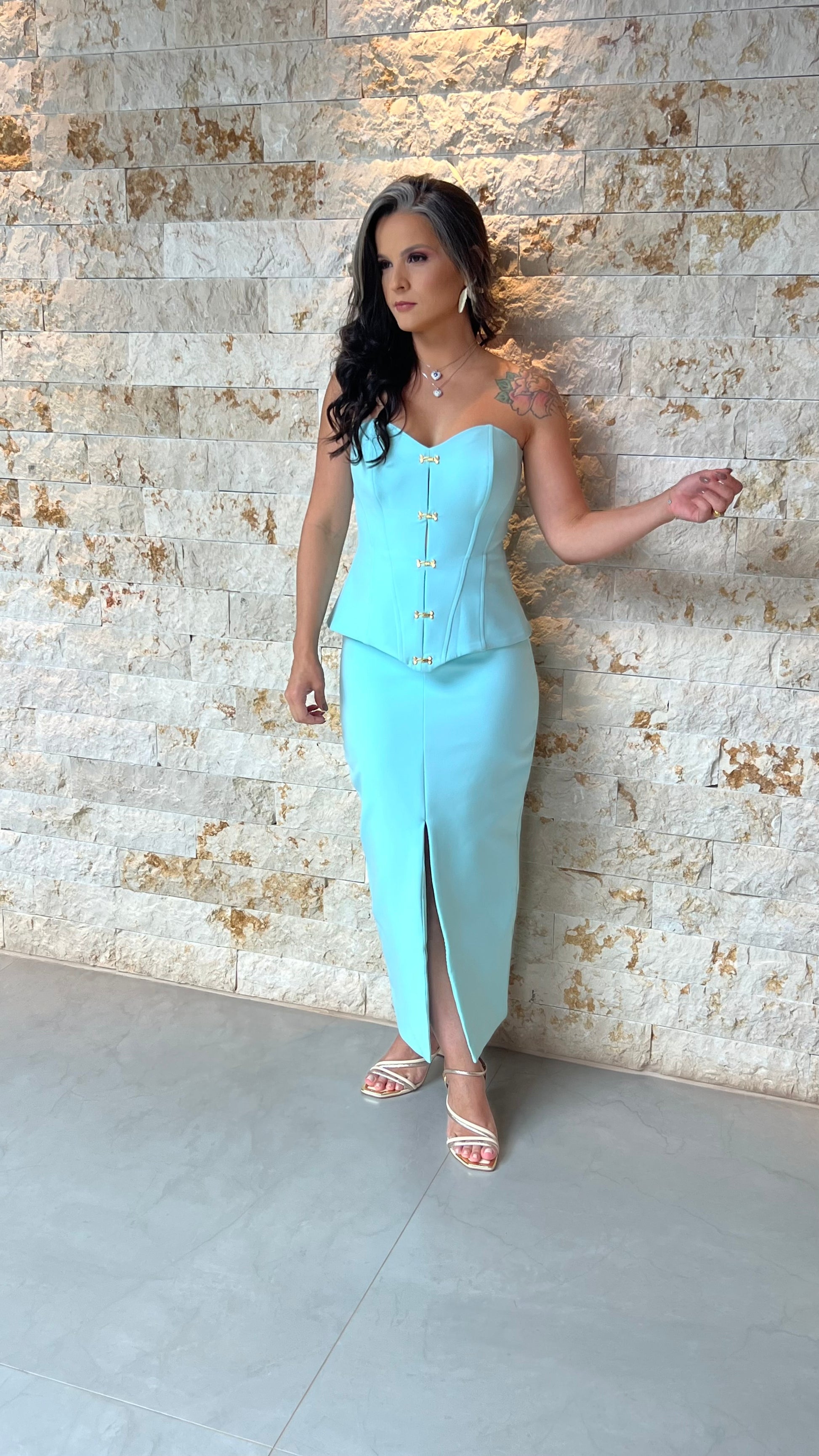 Este conjunto de duas peças é a definição de tendência e power dressing. A cor Turquesa é vibrante e sofisticada. O Top Corset é estruturado, com barbatanas que modelam o corpo, e aplicações de passantes em metal dourado.