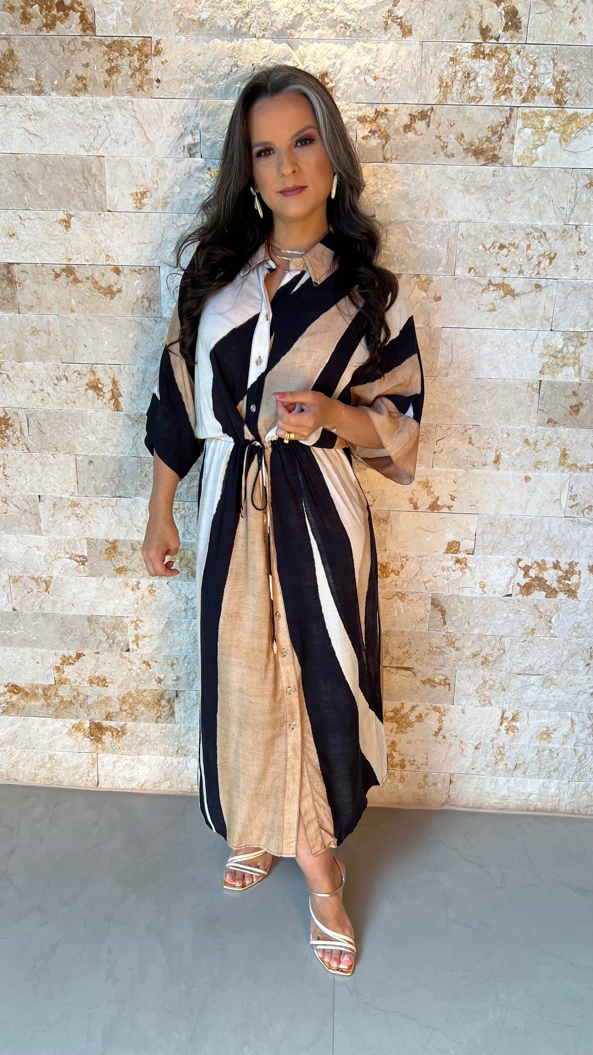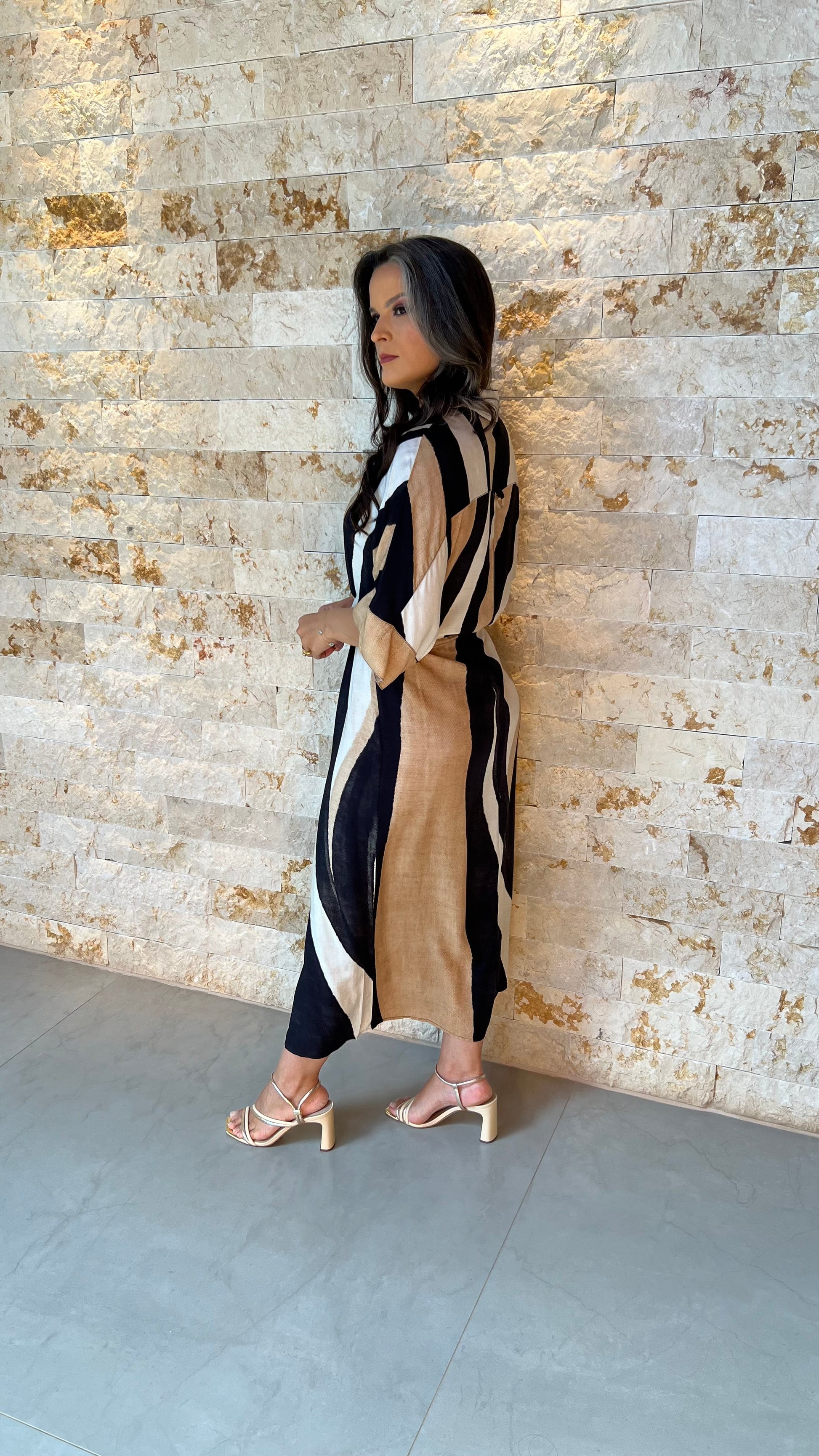 Feita em um tecido leve e de excelente caimento, a chemise se destaca pela sua estampa abstrata com faixas diagonais nas cores preto, branco e bege. A modelagem solta com mangas amplas garante total liberdade de movimento.