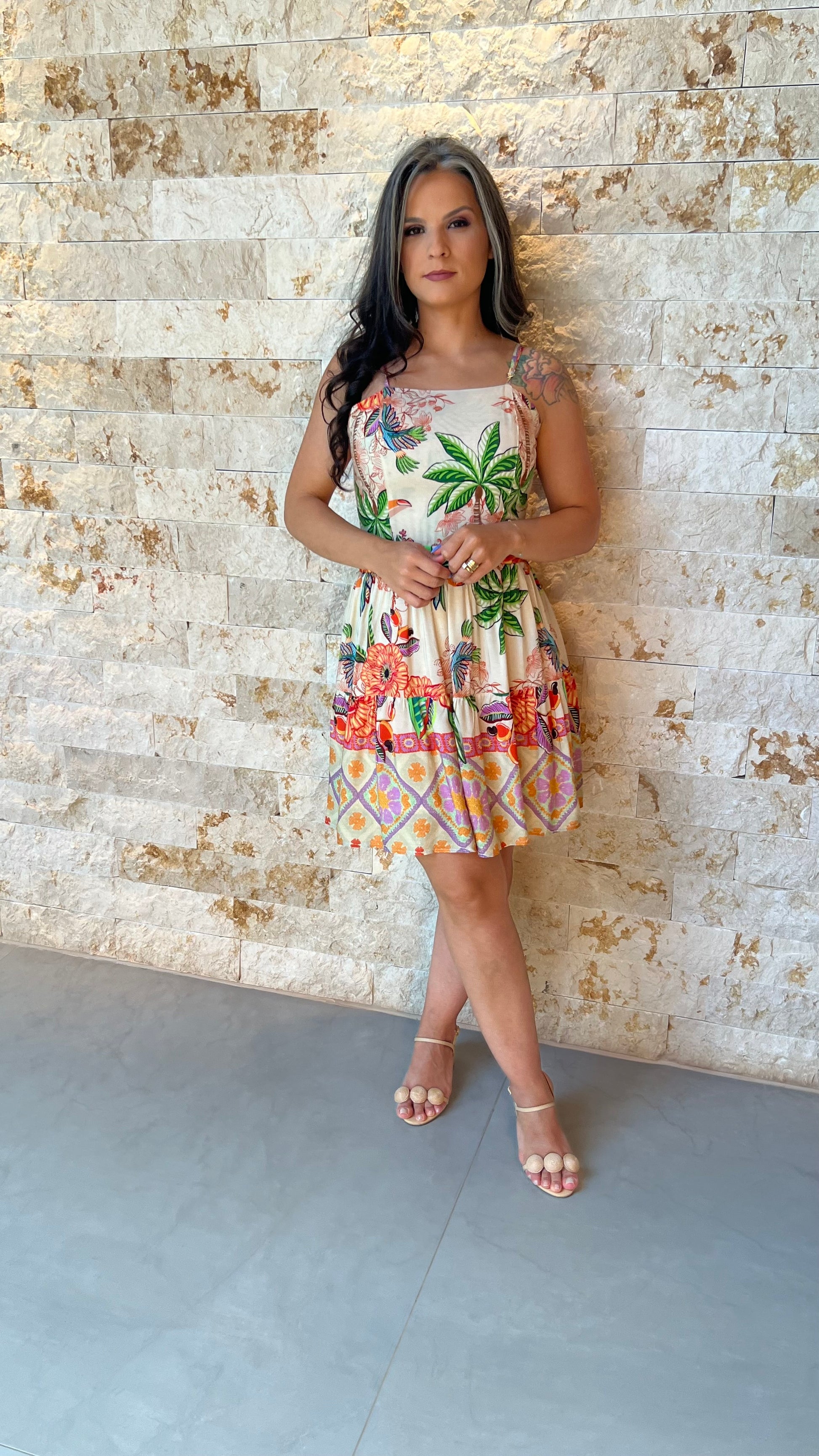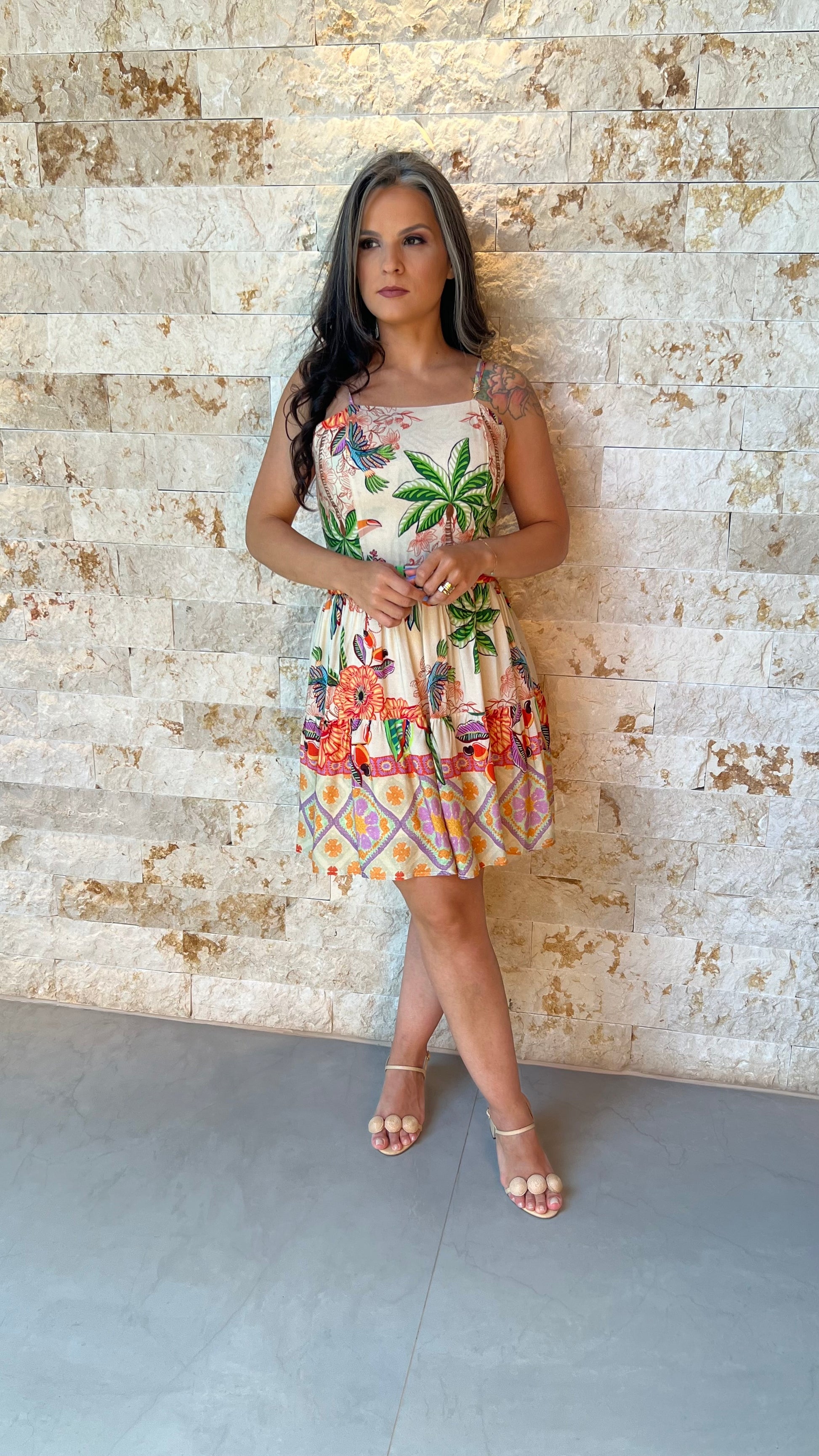 Vestido curto em viscose de alta qualidade com lindo detalhe de babados na barra e alças com regulagem. Peça incrivel que conta com uma estampa exclusiva da marca, possui amarração nas costas, acentuando as curvas naturais do corpo. Peça versátil e casual.