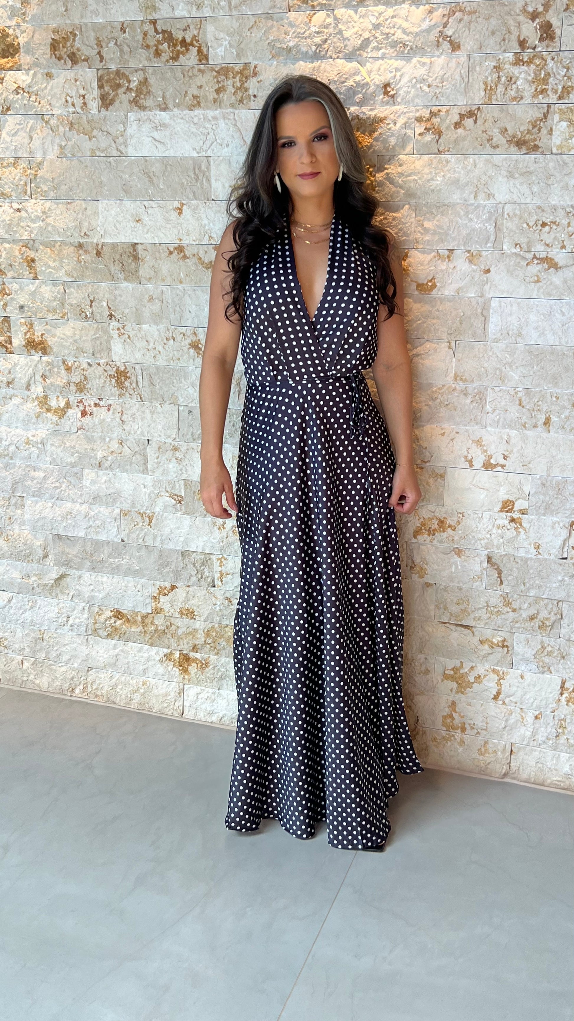 Clássico e atemporal, este vestido longo de poá é a peça perfeita para quem busca elegância e sofisticação. A estampa de bolinhas em preto e branco é um ícone de estilo, garantindo um visual chic e memorável.