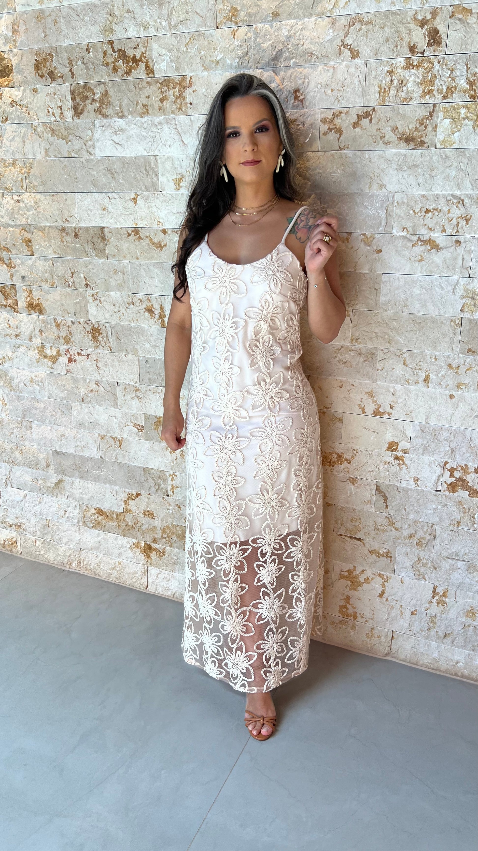 Exale delicadeza e sofisticação com este vestido longo em tule bordado, uma peça que celebra a feminilidade e a elegância. O trabalho artesanal da renda e os bordados florais criam um visual romântico e deslumbrante, perfeito para momentos especiais.