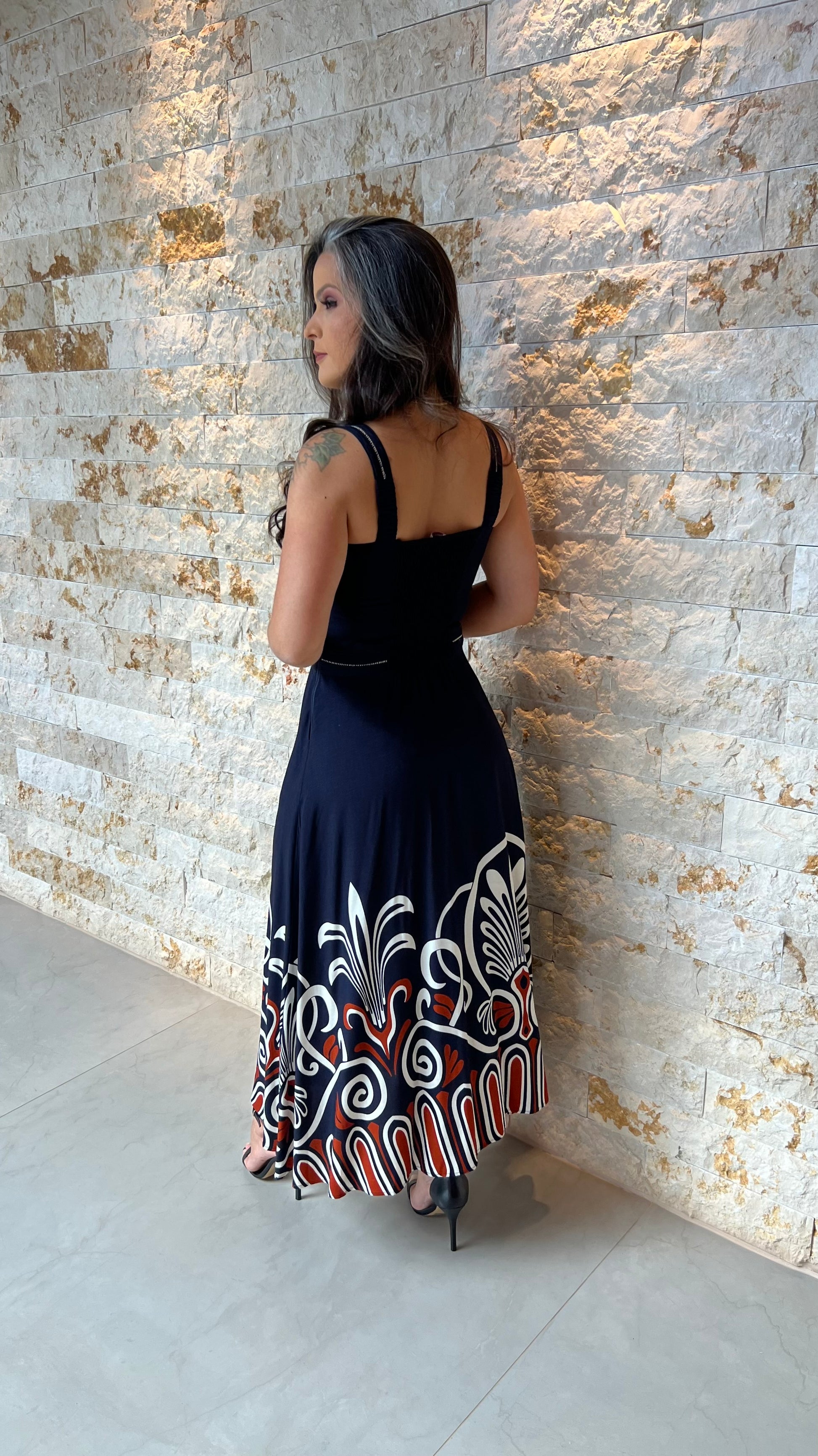 O vestido possui um decote quadrado clássico e alças finas, que valorizam o colo de forma delicada. A cor azul-marinho lisa na parte superior cria um contraste sofisticado com a saia. A cintura é marcada por um cinto fino e discreto, que ajuda a definir a silhueta.