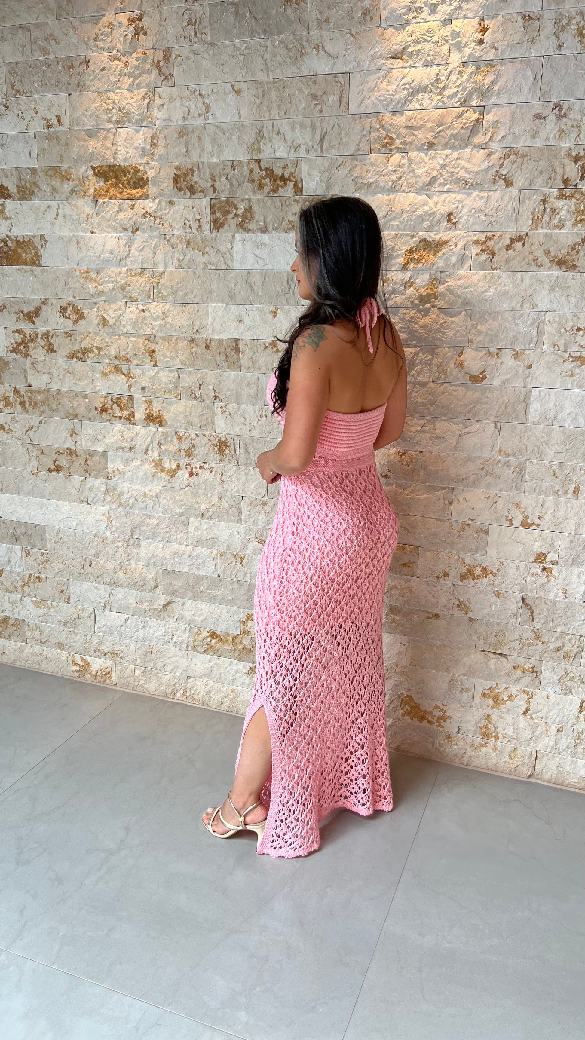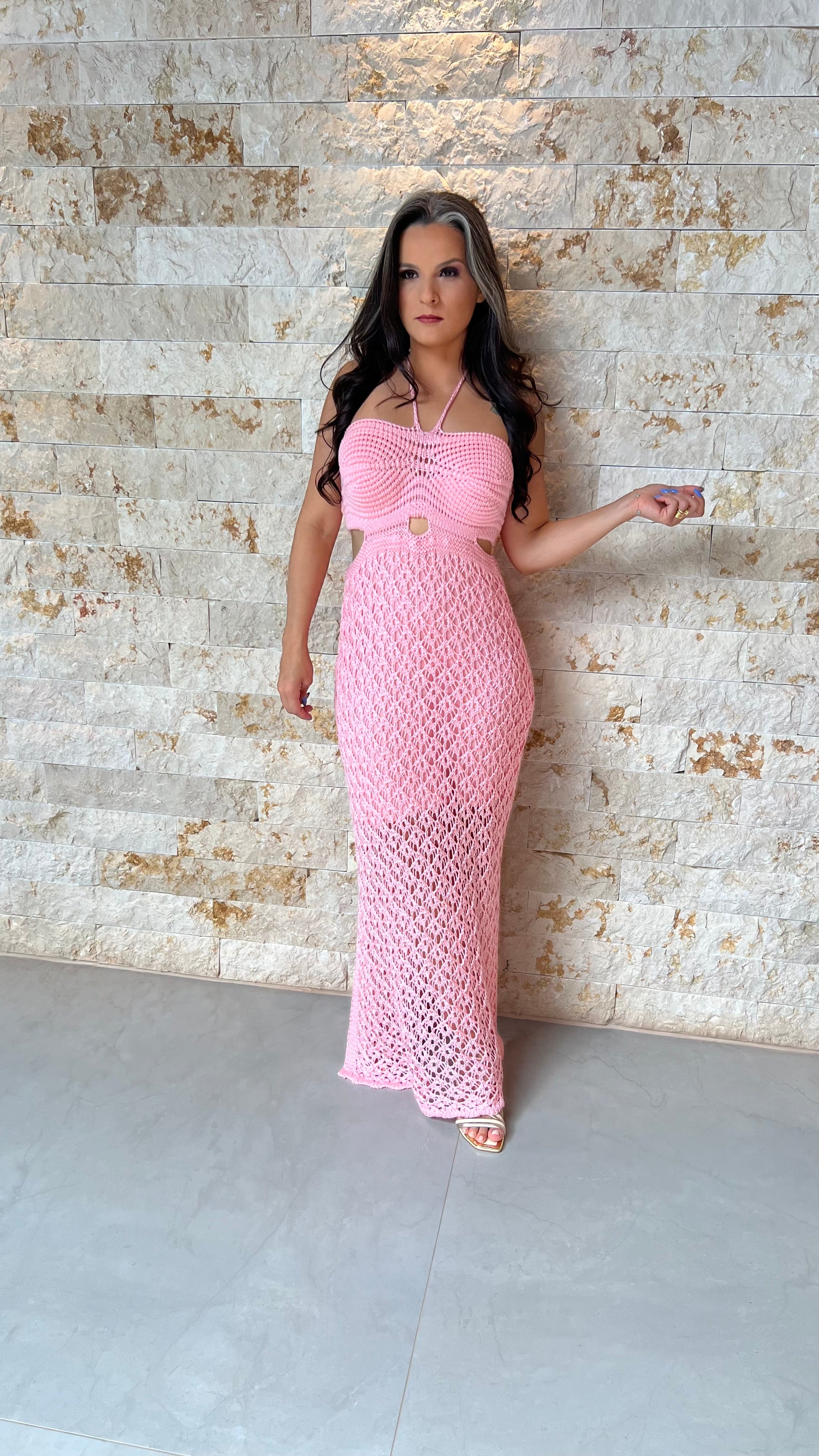 Vestido longuete lindo em tricot, leve, charmoso e confortável. Modelo de amarração no pesco com busto desenhado, possui lindo detalhe vazado na cintura e transparência na parte inferior, finalizando com fenda lateral, que dá sensualidade a peça. Essa peça é confeccionada em tricô de alta qualidade possibilitando que ela vista do tamanho 36 ao 44 com conforto e elegância.